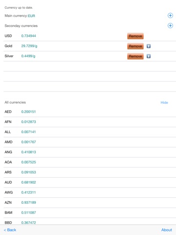 - The App stores the last updated rates so it works even without an Internet connection (after the first currency update).