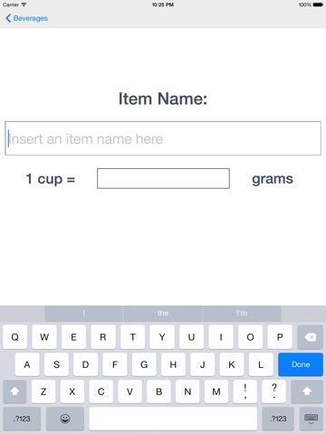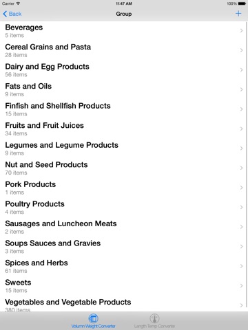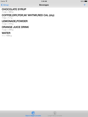 When you convert volume-to-volume or weight-to-weight, the item on the top doesn’t make a difference. Only when you want to convert between volumes and weights, the substance comes into play. You can change this item by tapping the “>” button next to it. The “+” button on top right will allow you to add a group/item. Swiping to the left will delete any existing group/item.