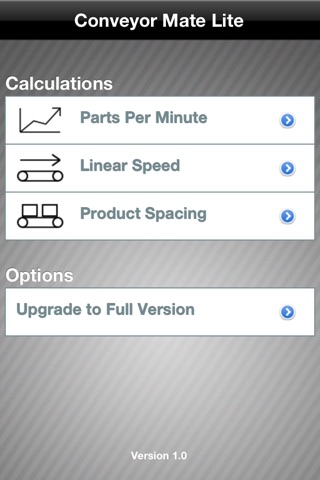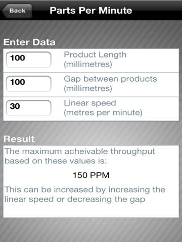 This app allows you to quickly and easily calculate maximum achievable parts per minute, required linear speeds for an application and maximum achievable gap between products for check weighing applications etc. All you have to do is enter the product data.