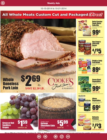 Cookes is a full-service, traditional store with all the departments one would find at a modern grocer. Our app streamlines grocery shopping, store location, hours of business, weekly specials, recipes for meals, and a customizable grocery list all available at your finger-tips!