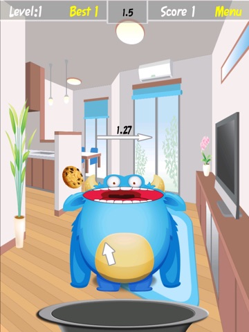 The goal is to shoot food into the mouth of the monster. Not so simple as a window is open creating a cross wind across the room. Throwing against the wind is not straightforward and you must thrust the food at an angle to control the throw. This sounds easy at first, but levels increasingly test your aim to target the monster’s mouth.