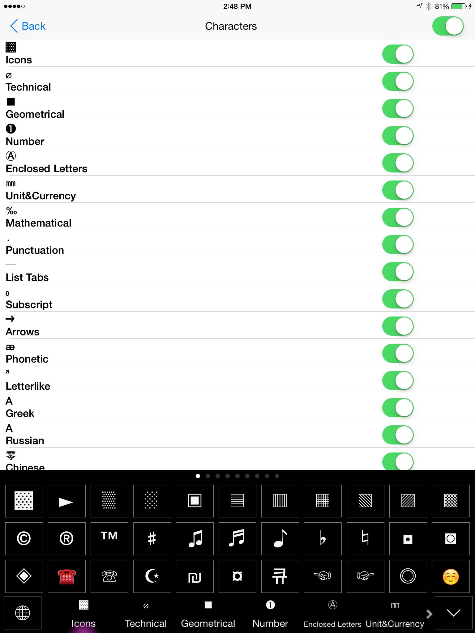 4. Special Characters Keyboard: contains 20 categories and more than 2000 special characters.