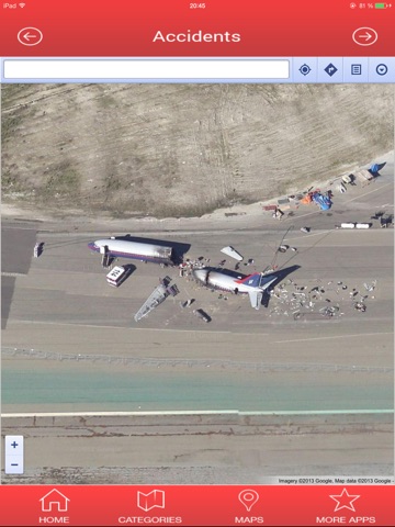 Since Google has released Google Earth and Google Maps, a lot of fans search the most interesting and curious details that can be seen via satellite. With "Cool Locations on Google Maps Lite" app you will see different google map crash locations with airplanes, wrecks, the Costa Concordia accident and more.
