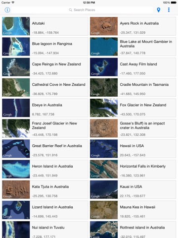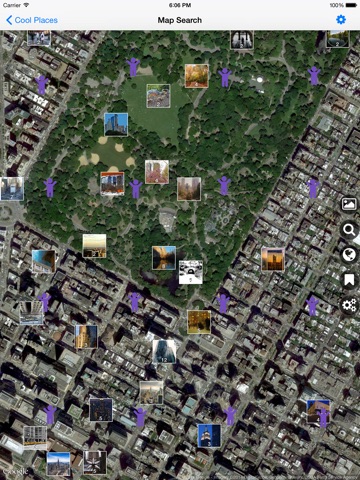 The iPad app shows Google satellite maps of more than 800 cool places from Panoramio.com.