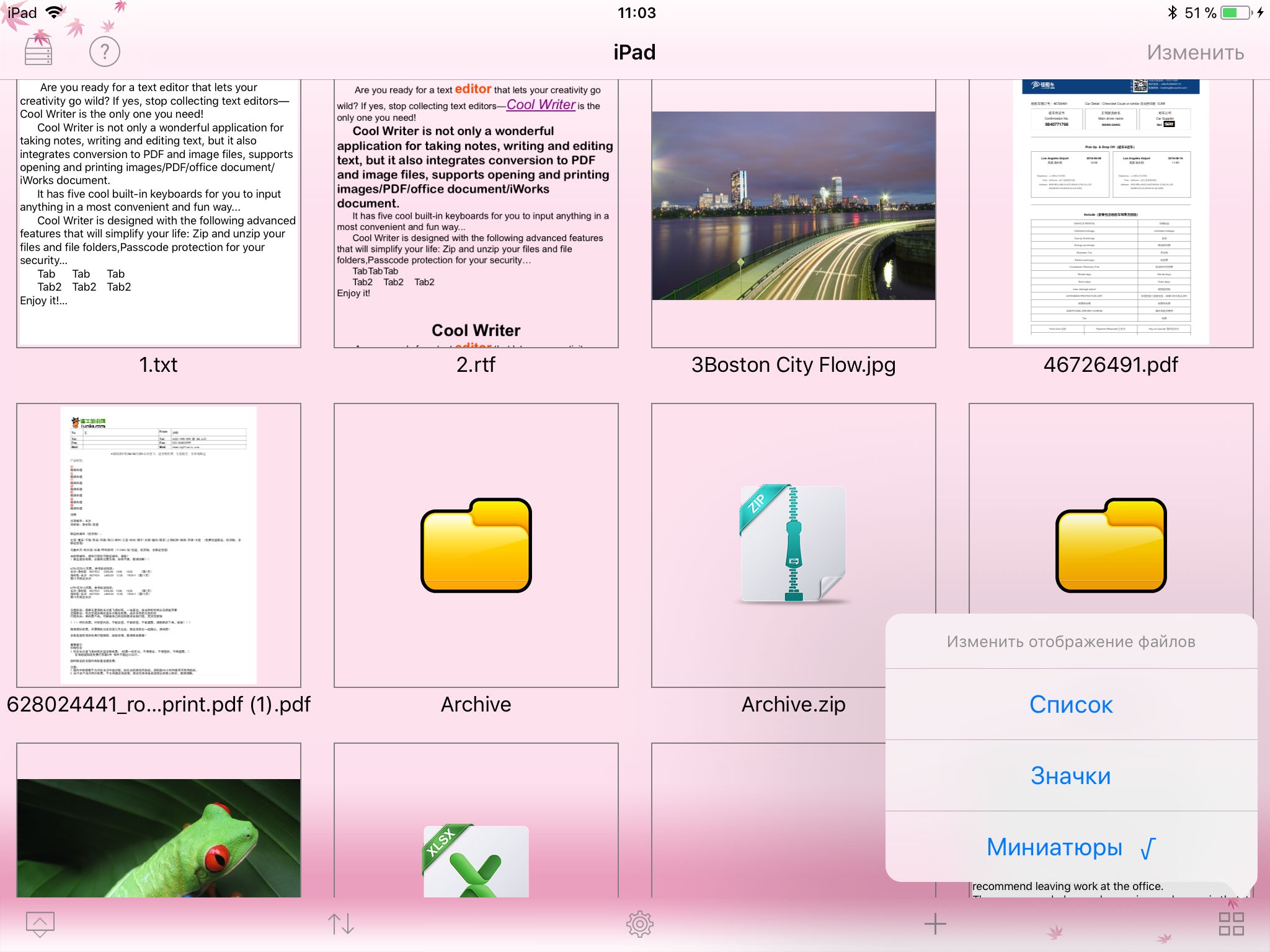 4. Sort your files by name, size, type, or time; Display files and folders as list, icons or thumbnails, Photos/txt/rtf/PDFs can be listed using big thumbnails.