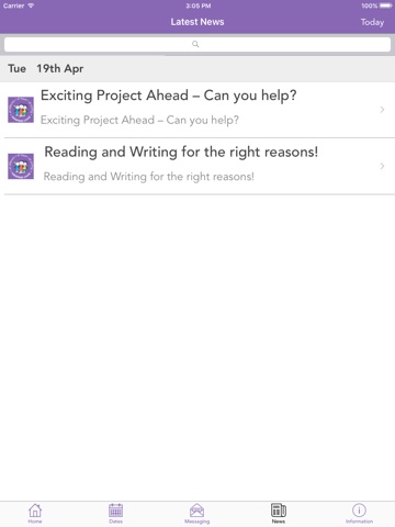 Shows all the latest stories from your school or organisation. If you tap on any news item you will be able to see more detail.
