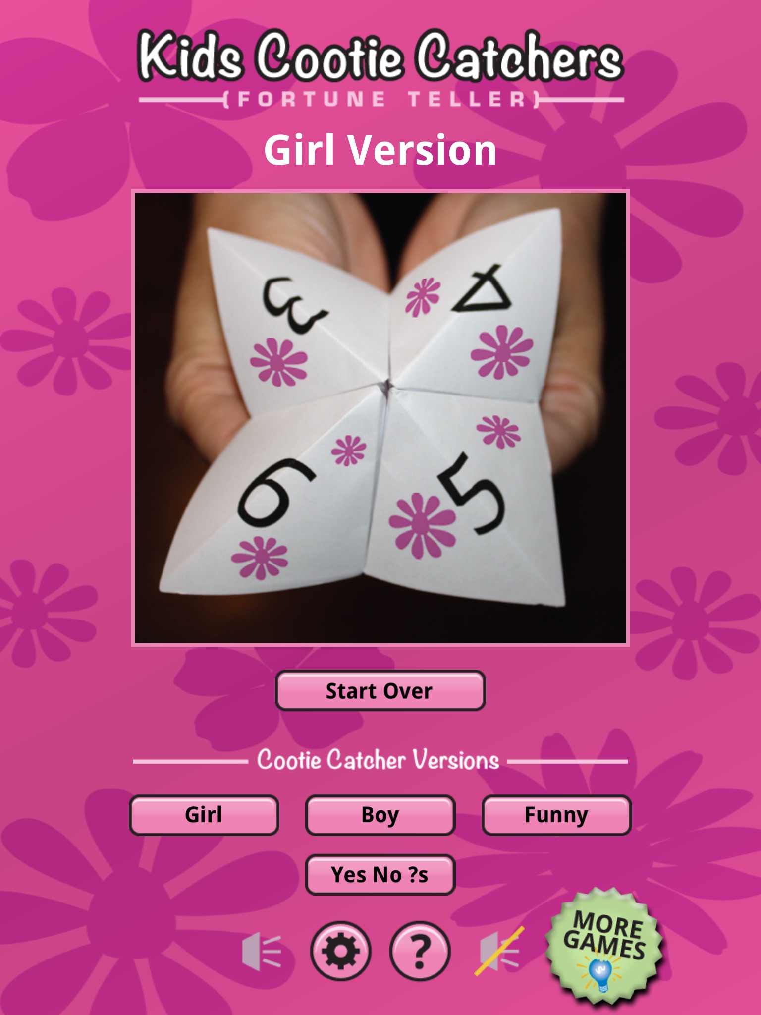 Cootie Catchers (Fortune Teller) is a digital version of the classic paper cootie catcher with fun themes. There are three different versions of fortunes (girl, boy and funny). There is also a yes no questions version. Ask it a yes no question and let it decide for you. Also called a fortune teller, salt cellar, whirlybird, wigwam or snapdragon and similar to MASH. You will have hours of fun without the hassle of having to make one. To play pick the version you want and then touch a number on the cootie catcher. Once it stops moving pick a color and then when it stops moving again pick another color to see your fortune.
