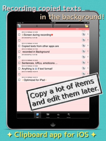 Sehr schade, denn dass die Hintergrundkopie in iOS 9 nicht mehr funktioniert, bedeutet, dass es auf meinem schönen neuen iPod touch nicht mehr funktioniert! Und damit ist es für mich nutzlos geworden. Dass es auf meinem iPad eins sowie meinem iPhone 4 funktioniert, ist nur ein schwacher Trost… Schade! Dann der Support ist eingestellt, definitiv. Für ältere Geräte, bis iOS 7, möglicherweise auch 8, gilt das Nachfolgende trotzdem: Es tut genau was es soll: sämtliche Kopieraktionen auf die iOS-Zwischenablage werden von der App gespeichert in einer Tabelle, in der diese gesammelten Schnippsel, wenn Text, bearbeitet werden können, mit Titel versehen, in Ordner abgelegt und per SMS oder Email verschickt werden. Außerdem lassen sich neue Snippets anlegen, Snippets aneinander hängen sowie enthaltene URLs öffnen. Nach der vom iOS begrenzten Hintergrundzeit (10 Minuten bis inkl. iOS 6) kommt eine Benachrichtigung, mit der direkt zu CopyCan zurückgewechselt werden kann, um die Zeit zu verlängern... Fazit: sehr brauchbare App, nun auch Universal! Wünsche für die Zukunft: Sync z. B. per Dropbox und/oder iCloud; Senden an Mac-/PC-Zwischenablage (wie etwa bei ClipTwin); RichText, also Text mit Formatierung, Links, Bildern; Übernahme beliebiger Formate, um z. B. Sounds zwischenzuspeichern; ...