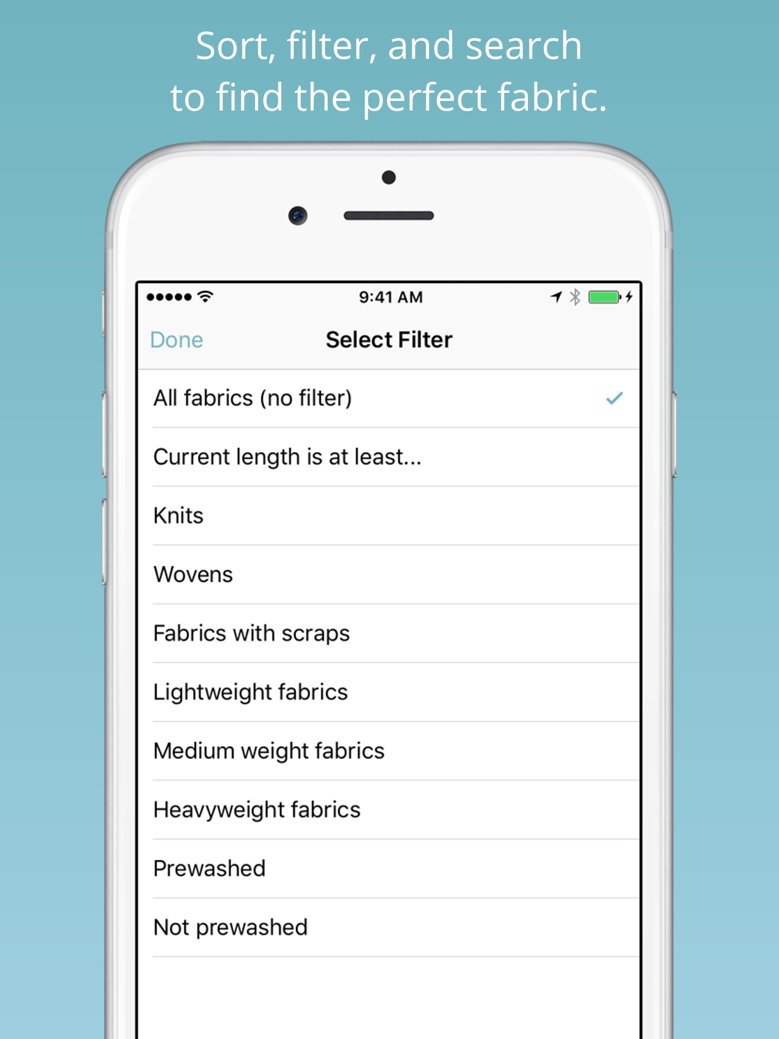 - Filter by color or length to only see fabrics that work for your project.