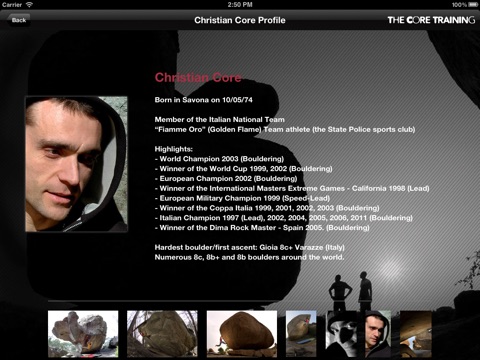 This App, created by Christian Core, is an educational and interactive workouts, divided into various levels, appropriate for both those who want to prepare for national and international competitions and to those who want to improve their skills in climbing, for a safer and smoother progression in the mountains.