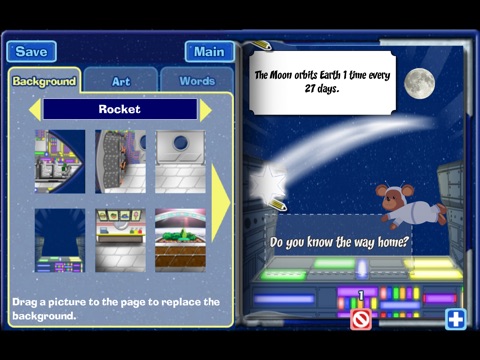 Your child can create exciting illustrated stories about adventures in Outer Space using the Cosmic Cubs Club Story Maker. Simply choose a background, add colorful characters and other artwork, then choose word balloons and select from hundreds of available words and phrases. Add pages one by one to continue the story. It all adds up to hours of educational fun for children ages 4 through 10. The Cosmic Cubs Club Story Maker -- One Giant Leap for Early Science Education!