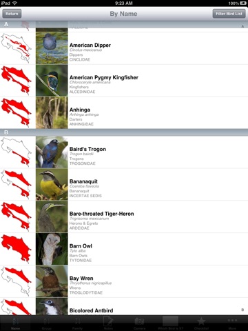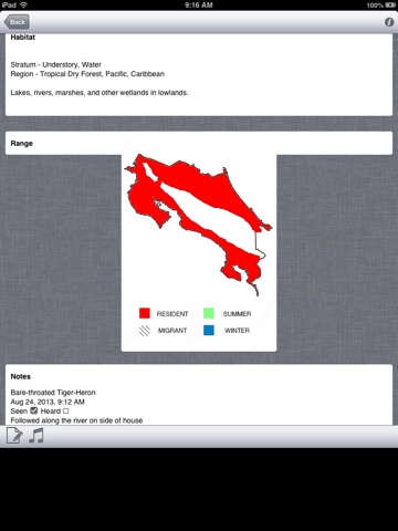 I love birding in Costa Rica, but carrying around a printed field guide is not a favorite part of it. This new app is just what I have been waiting for! It doesnt have all the birds that can be seen in Costa Rica - for example, it doesnt have the Solitary Eagle. But it does have everything youre likely to see, and Im sure the developers will continue to seek out and photograph those rarely seen species that are missing. I like the search features and I like being able to see the birds either by alphabetical listing or by family. You can mark in notes whether the bird was seen or heard, which I very much like. And, the maps help a lot. I can hardly wait for updates, such as being able to make lists for ebird.
