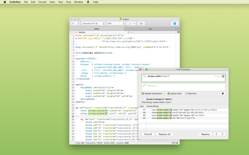 It’s the first text editor that accepts regular expressions and allows n (cr lf) substitutions. It would be perfect if the app implicitly permits crlf searches/exhibition, like in notepad++.