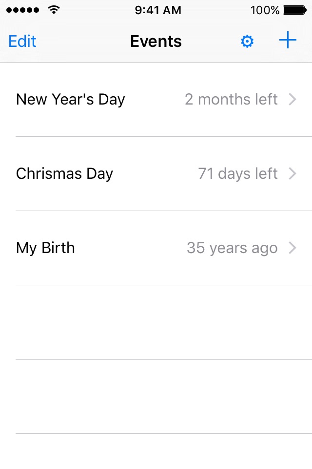With "Countdown", you can check how far is an event from now, or even how long ago in the past an event has happened. You can also view the time in years, months, days, hours, minutes or seconds and add an unlimited number of events.