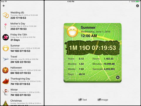 Countdown++ will allow you to generate a countdown clock for practically any event in time, whether you need to know exactly how long is left until the last Monday of the month or the next Friday 13th. Furthermore, Countdown++ will make sure you don’t forget, providing you with the ability to setup multiple notifications for each event.