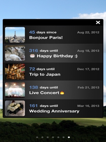 Use this app to countdown important meeting,your wedding day, valentines day, the first date, birthday, anniversary, the birth of your children and baby, holiday, meeting, trip, party, vacation, discharge, exam, days of quitting smoking, graduation, halloween, new year, thanksgiving … and all of the other very important days of your life with full graphics and animation effects.