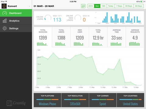 With Countly mobile app, you can connect to a Countly server (Community Edition, Cloud Edition or Enterprise Edition), and get real-time sessions, users, countries and time spent together with top platform, top resolution, top carrier views and more. Never miss an analytics data when you are travelling!