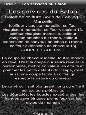 Lapplication Coup de Feeling vous offre la possibilité de consulter toutes les infos utiles du salon (Tarifs, prestations, avis…) mais aussi de recevoir leurs dernières News ou Flyers sous forme de notifications Push.