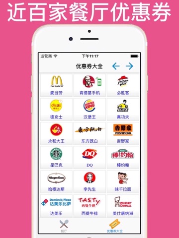 只寻找附近支持优惠券的大型连锁餐厅,让你每顿吃的划算!