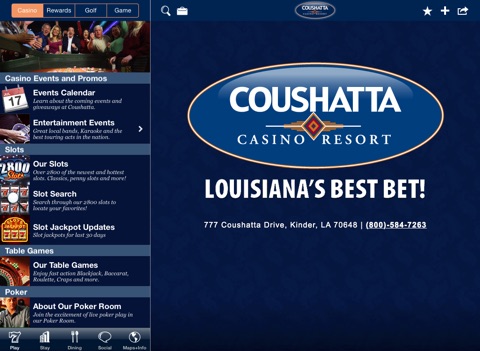 Experience Louisiana’s best bet on mobile with the official mobile app for Coushatta Casino Resort! The free mobile app gives you easy on-the-go access to the hottest promotions, entertainment, dining, casino games, interactive maps and more through hundreds of pages of dynamic content.