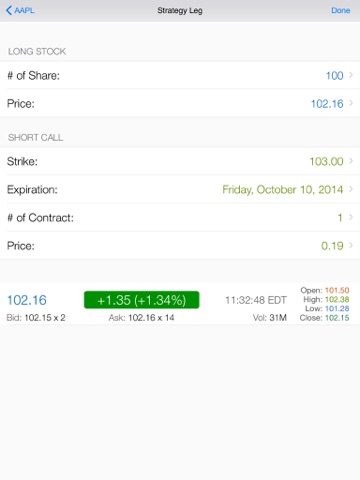 Being a fan of using covered call as your secret weapon to boost your profit? Just got your level I options trading approval to short covered call? This app is dedicated to helping you build, evaluate, and study covered call positions easily and quickly. It comes with a highly-praised and fast loading options chain, touch based interactive profit/loss graphs, simulator of the time decay and Implied Volatility change, etc. It provides the fastest way to plan your covered call strategy. Plus, Real-Time underlying stock quotes and current Implied Volatility are included. You can further customize and manage your covered call strategy. Best of all, it is all FREE.