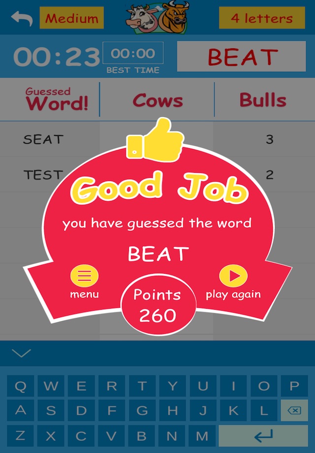 For example, if the secret word is GATE, and the first guessed word is SOIL would result in "0 Cows, 0 Bulls" (since all the guessed letters are not in the secret word). If the guessed word is TRIM it would result in "1 Cows, 0 Bulls" (since T is present, but not in the exact position), and if the guessed word is RAGE it would result in "1 Cows, 2 Bulls" (since A and E are in the right positions, while G is in the wrong position). The game would continue until you guess the right word with "4 Bulls".