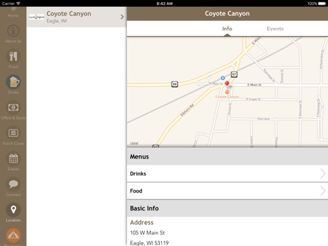 Stay connected with Eagle, Wisconsins premier restaurant through The Coyote Canyon app! View menus, see our special event calendar, come try our massive beer selection and more! Whether youre celebrating a special occasion or just looking for a fun evening out, youll find amazing deals inside the Coyote Canyon app!