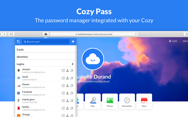 Cozy Pass remembers and synchronises all your passwords for you. By installing the "Cozy Pass for Safari" you will be provided a Safari addon that will enable you to access your passwords, payments cards and identities while browsing the internet on Safari.