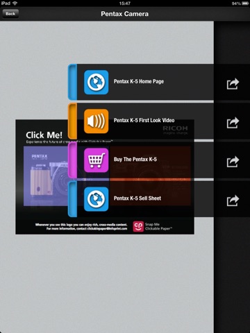 Clickable Paper is a new cross media service enabling consumers to point a smartphone at any printed surface and receive related online content. Clickable paper links printed pages to related online resources such as video, websites, e-commerce sites and social networks.Just point and click and enjoy exploring rich online contents.