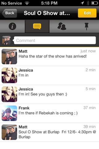 • Create plans with a group of friends & chat in real time - friends who don’t have the app get a free group text and email