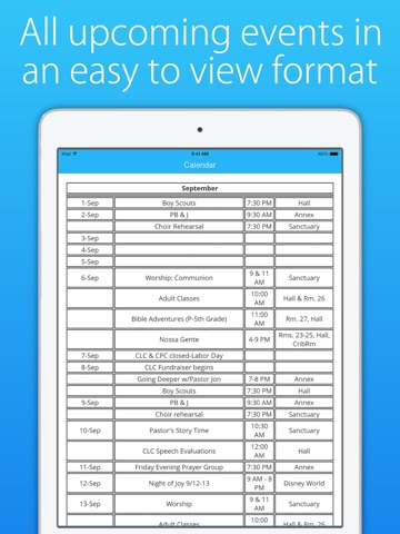 This App was created for Central Presbyterian Church and can easily be used to stay up to date with the latest information. Features include a feed, a calendar, a weekly sermon and a lot more!