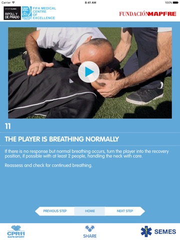 In a simple way and in just 11 steps, the CPR 11 application offers a plan with clear and precise instructions on how to give compressions and ventilations correctly, how to handle an automatic external defibrillator (AED) and if necessary, how to transfer the player.