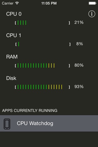 With "CPU Watchdog" you can get an accurate and reliable breakdown of your devices resources. See how much of your CPU and RAM is in use. You can also see how much of your devices storage is being used. "CPU Watchdog" also offers a list of apps that are currently running in the background. CPU Watchdog also offers a Notification Center Widget to give you details about your device at a glance!