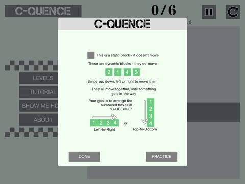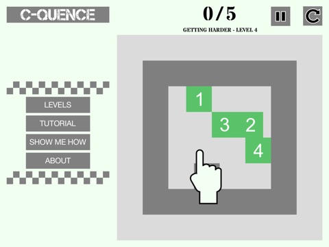 Swipe up, down, left or right to move the numbered blocks and arrange them in "C-QUENCE", either left-to-right or top-to-bottom.