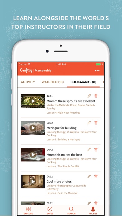 Stream lessons anytime, anywhere, at your own pace. Save and download your favorite classes so you can watch them without an internet connection. You can also bookmark specific moments to pick up right where you left off.
