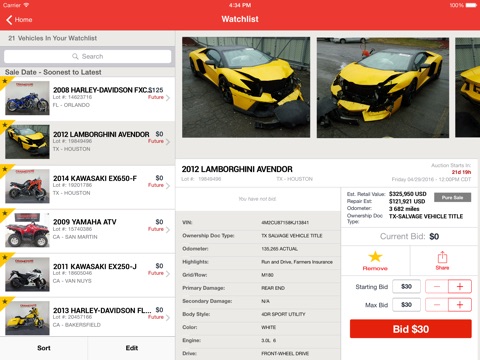 The CrashedToys App allows you to bid on and buy motorcycles and powersports vehicles from anywhere. Find motorcycles and other vehicles by type, year, make, model and location. Get notified about the results of your auctions and stay informed about the motorcycles and other vehicles on your Watchlist. Not a CrashedToys Member? Register for FREE with the CrashedToys App. The CrashedToys App lets you participate in online powersports auctions hassle-free!
