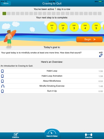 The Craving to Quit app provides daily instruction through playlists of audio and video tracks, goal-setting tools, and daily reminders. As you progress through the program, we will walk you down to 0 cigarettes/day by giving you the tools you need to successfully quit smoking –one step at a time.