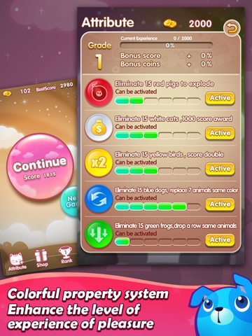 Crazy Pang has a bomb , color , drop , double and additional grading five kinds of skills. Different level of skill , power is not the same oh .