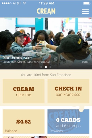 Mobile Payment and Digital Loyalty Card built-in: no more searching for cash or swiping cards. And youll never miss out on a free CREAM treat when youve got enough stamps, because the app keeps track of your reward stamps.