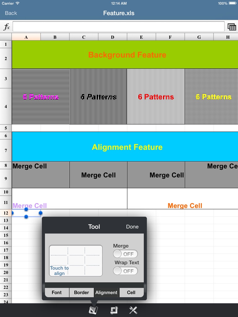 ● Cell formatting, including bold,underline, italic, borders, text and cell color, alignment, text wrapping and so on.