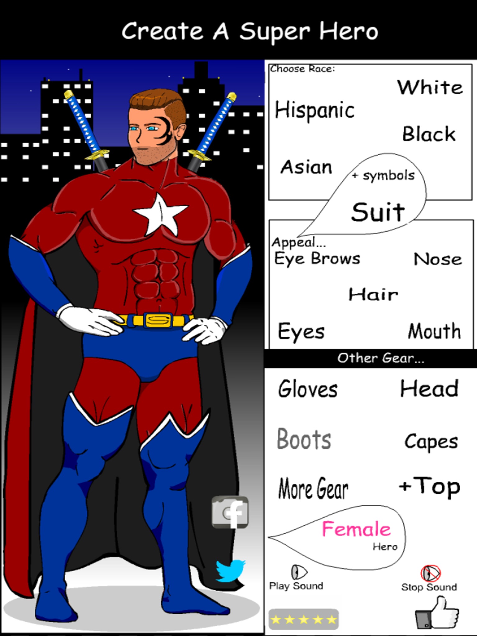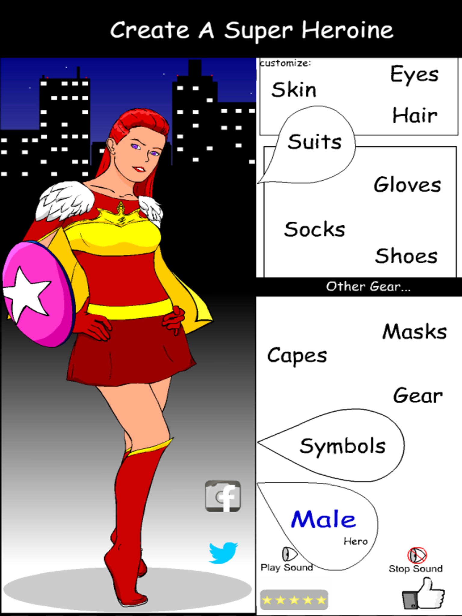 Create and customize a Superhero. Choose a female or male character, then customize your Superheros appearance with different suits, masks, capes, boots, gloves and symbols.