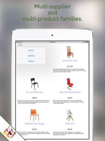 With this application, from your iPad or iPhone, you can create and maintain your product catalogs based on photos, descriptions, and prices. Your product features can be entered directly into the app or imported in text format with ease. You can effortlessly add a cover page, table of contents, and end page to give your catalogs a distinctly professional image.