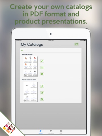 • Sending catalogs in PDF format by email or sharing in compatible apps.