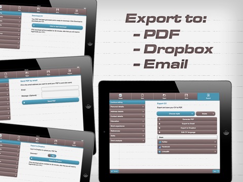 In a few steps you can create your résumé by filling in your personal details, education and work experience. After that you can export your CV to PDF, email PDF to anybody or download your cv on your iPhone or iPad.