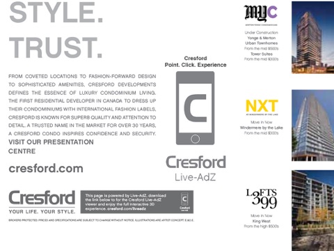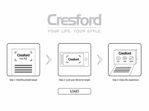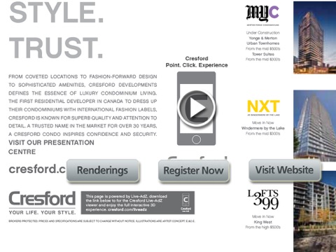 Simply hover the App over any of Cresford Developments magazine, newspaper or other print materials, which have lock targets to discover virtual buttons linked to 4D rich media content. Use these pop up buttons to explore video, audio, 3D illustrations, website content and even register directly for more information about a project.
