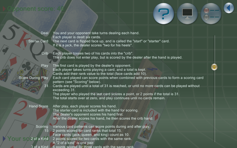 Enjoy playing Cribbage anytime against the computer, with the same silky-smooth 3D experience of Solitaire Forever. Features include cards that move and flip in 3D space, unlimited undo/redo, two skill levels, statistics, multiple card decks and card backs, and full screen and windowed modes. You never need to look for an opponent again.