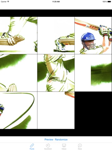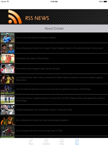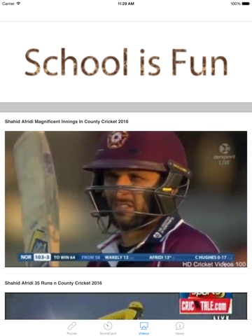 The App features Cricket Puzzle, Scorecard feature, Learn and watch Cricket videos.