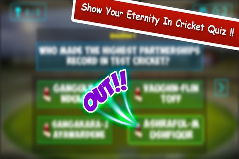 Your total score & no. of fallen wickets will be shown on the leftside of the screen. Format should be alike cricket matches, runs/wickets. Bonus points from the timer value will be added to your total score.If an user give a correct answer within 5 seconds of the questions appearance then he will get bonus 5 points. A point will be decreased per second increase. So If an user give a correct answer within 8 seconds he will get 2 points. Else failure to answer correctly within 10 seconds will cost you addition of no bonus points.