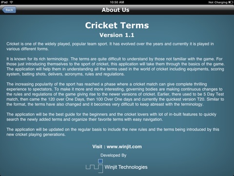 It is known for its rich terminology. The terms are quite difficult to understand by those not familiar with the game. For those just introducing themselves to the sport of cricket, this application will take them through the basics of the game. The application will help them in understanding all the terms used in the world of cricket including equipments, scoring system, batting shots, delivers, acronyms, rules and regulations.
