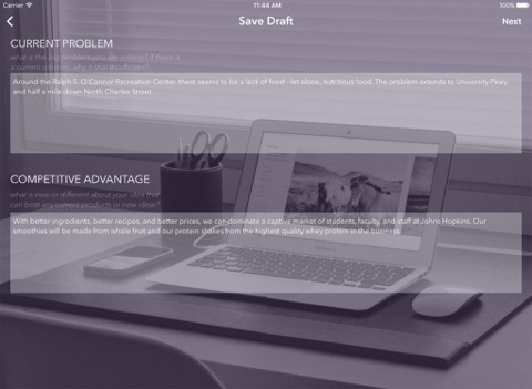 Quickly distill your idea into four main sections: the Problem, your Advantage, the Model, and the Users.
